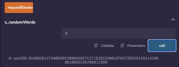 3. Each time you make a VRF request, your consumer contract requests two random words. After the request is fulfilled, the two random words are stored in the s_randomWords array. You can check the stored random words by reading the two first indexes of the s_randomWords array. To do so, click on the s_randomWords function and: